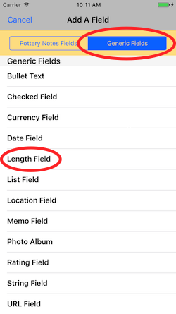 Step 4 - On the "Add A Field" screen you have the option to add fields that are specific to ceramic projects (PotteryNotes Fields) and general fields. In the example below we are going to go to the Generic Fields tab and select a "length field". You can select any kind of field you would like. You are encouraged to experiment with different kind of fields and see how they work.
