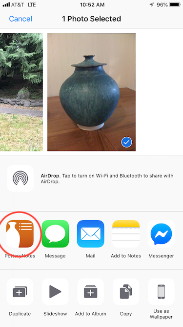 Create new records or add photos to existing records to PotteryNotes directly from the Photo App.
