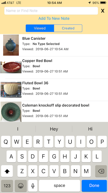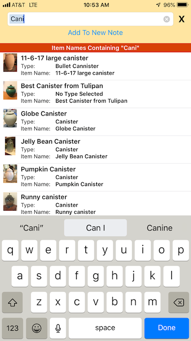 As you begin to type, PotteryNotes will search on whatever text you enter. Search results will update as you continue typing.