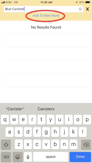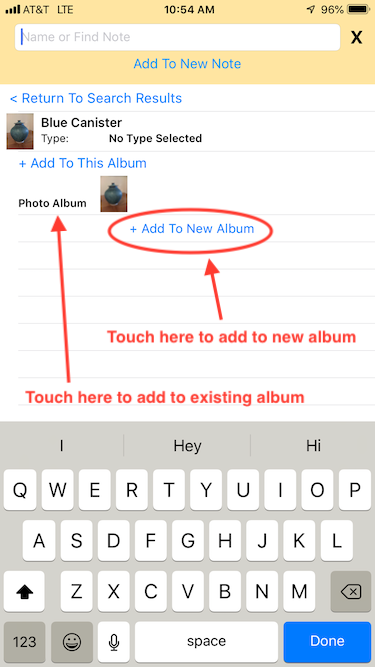 You can add the image(s) to a new record by touching “Add To New Note” after you are satisfied with the name you have written. In the example below, the name typed does not match any existing records so the results screen is empty.